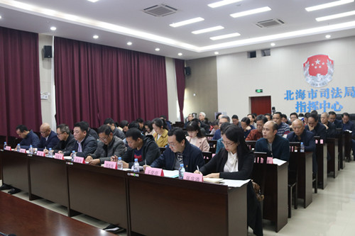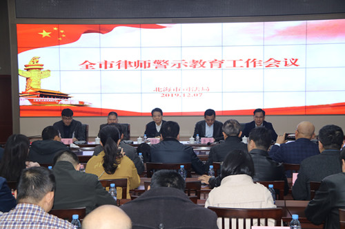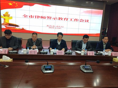 为认真贯彻落实司法部和自治区纪监委有关会议精神,规范律师执业行为,12月7日上午,北海市司法局召开全市律师警示教育工作会议。自治区司法厅党委委员、副厅长、广西律师行业党委书记杜恒年,北海市司法局党组书记、局长唐岗,驻市委政法委纪检监察组组长陈万强出席会议,北海市司法局党组成员、副局长、北海市律师行业党委书记杨炳贵主持会议。