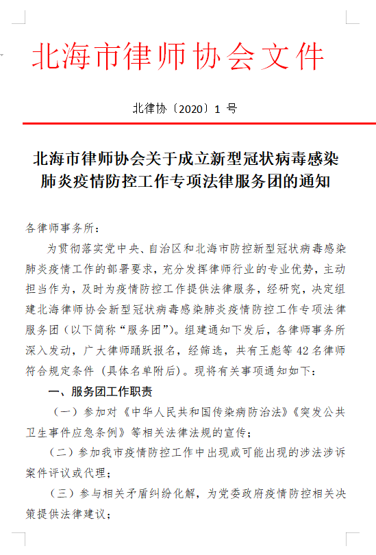 为充分发挥律师职能作用,及时为全市疫情防控工作提供专业的法律服务,乐发vll500迅速发出了组建新型冠状病毒感染肺炎疫情防控专项法律服务团的通知。全市各律师事务所积极响应号召,踊跃报名,经过筛选,成立了由王彪等42名律师组成的专项法律服务团。疫情期间,北海律师将以实际行动,针对北海全市的疫情防控开展专项法律服务工作,充分展示出北海律师的责任和担当,全力以赴打赢疫情防控阻击战!