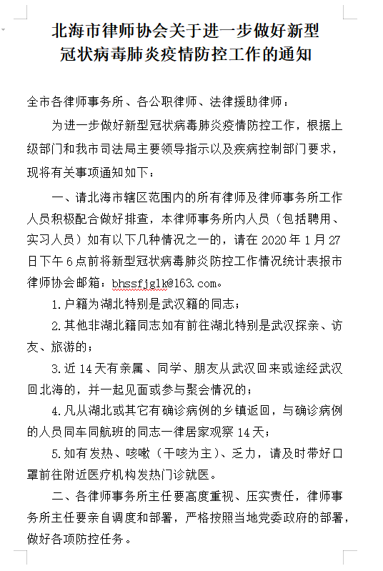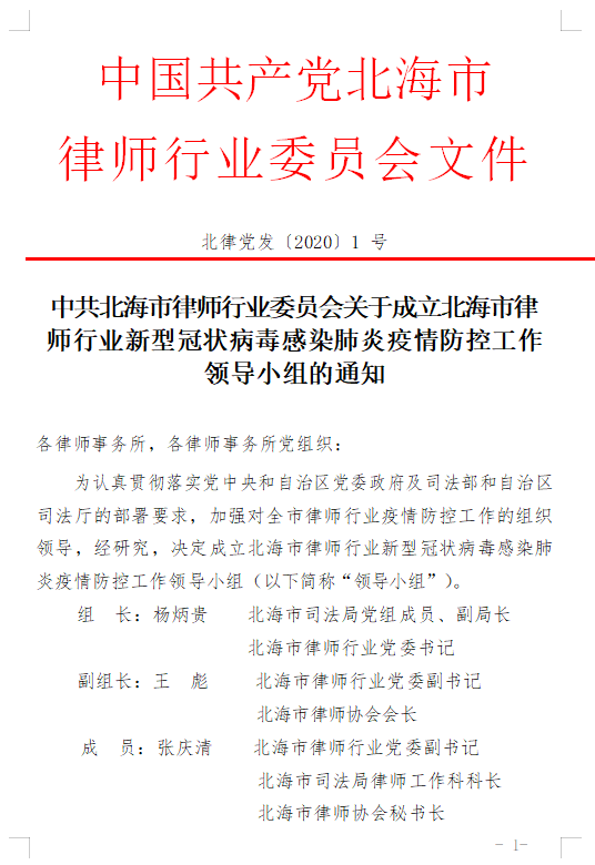 一、北海市律师行业党委成立北海市律师行业新型冠状病毒感染肺炎疫情防控工作领导小组