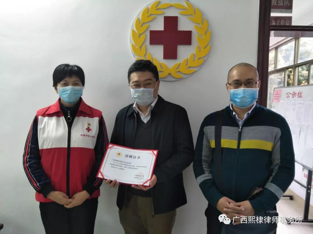 疫情发生后,律师纷纷表达对抗击新型冠状病毒感染肺炎疫情的关心之情。为支持抗击新型冠状病毒感染肺炎疫情,广西熙棣律师事务所及全体律师向北海市红十字会捐款13000元,北海市红十字会伍海燕副会长向该所颁发了捐赠证书,并对该所的捐赠行动予以了高度评价。