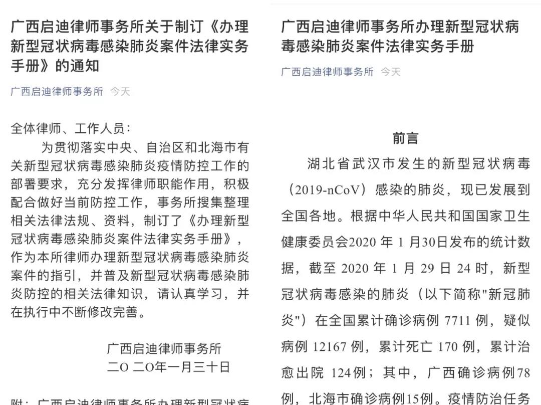 五、广西启迪律师事务所制订《办理新型冠状病毒感染肺炎案件法律实务手册》