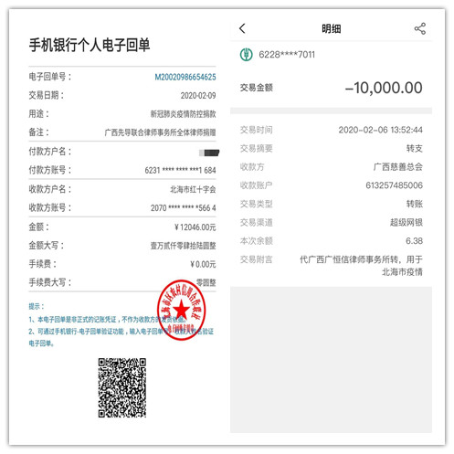 此前,广西广恒信律师事务所、广西先导联合律师事务所和广西先导联合(海城)律师事务所先后向广西慈善总会、北海市红十字会捐赠爱心款项10000元和12046元用于疫情防控,表达出他们对疫情防控阻击战的关注与关心。