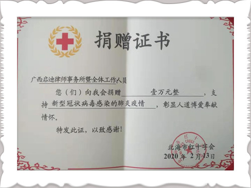 2月13日,广西启迪律师事务所党支部积极发动全所律师和工作人员向北海市红十字会捐赠10000元,充分发挥党员先锋模范作用。我市律师们都在为战胜疫魔贡献出自己的一份力量。