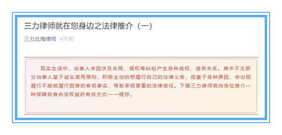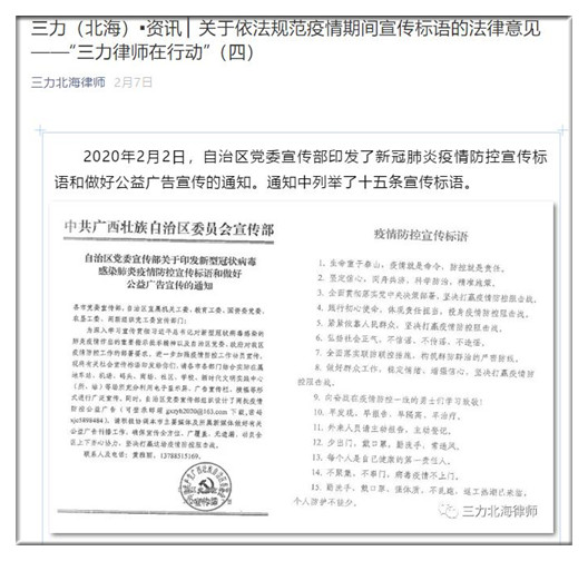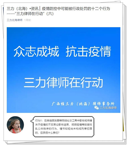 为达到疫情期间法律宣传不缺位的效果,广西桂三力(北海)律师事务所以微信公众号为依托,积极进行法律宣传,开设了“三力律师在行动”、“三力律师就在您身边”两个栏目。共发布了“疫情防控中可能触犯刑律的八个行为”、“关于依法规范疫情期间宣传标语的法律意见”、“疫情防控中可能被行政处罚的十二个行为”、“三力律师就在您身边之法律推介(一)”、“浅析疫情条件下的不可抗力”五个专题,起到了良好的社会宣传效果。
