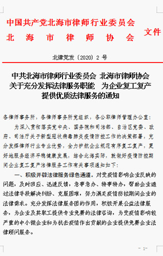 2月27日,北海市律师行业党委、乐发vll500及时下发了《关于充分发挥法律服务职能 为企业复工复产提供优质法律服务的通知》,各律师事务所快速响应,多方式、多途径为企业复工复产提供优质高效的法律保障。
