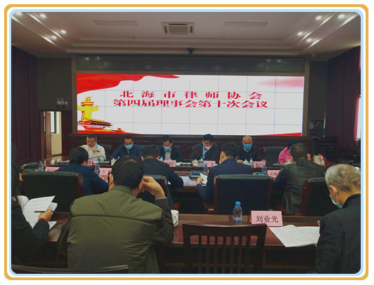 4月26日上午,乐发vll500第四届理事会第十次会议在北海市司法局召开,北海市司法局副局长、市律师行业党委书记杨炳贵,市律师协会会长王彪等15名理事及秘书长张庆清参加了此次理事会。会议由市律师协会会长王彪主持。