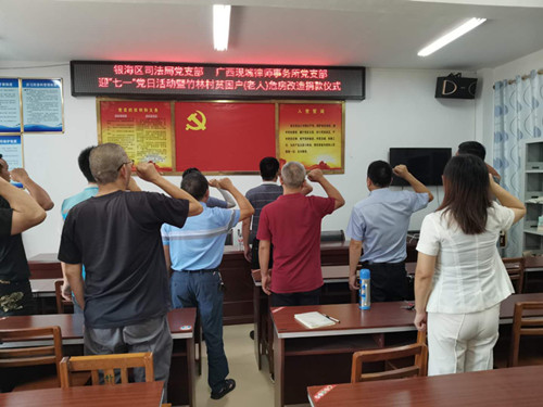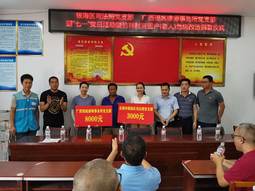 2020年6月24日,北海市银海区司法局党支部联合广西现城律师事务所党支部在北海市银海区福成镇竹林村委开展迎“七一”党日活动暨竹林村贫困户危房改造捐款仪式,银海区司法局和广西现城律师事务所党支部全体的党员参加了此次活动。