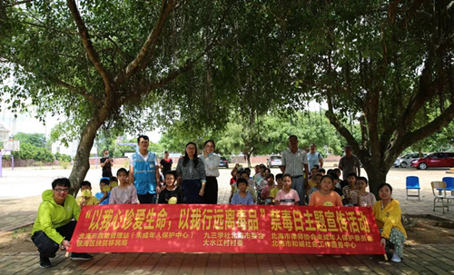 为了进一步提高未成年人识毒、防毒、拒毒意识,保护和促进未成年人健康成长、提高抵御毒品的能力,预防未成年人因毒品走上违法犯罪的道路,2020年6月24日上午,乐发vll500未成年人保护专业委会员、北海市救助管理站(未成年人保护中心)、九三学社北海市委会一同开展的“以我心珍爱生命,以我行远离毒品”禁毒日主题宣传活动在福成镇大水江小学举行。