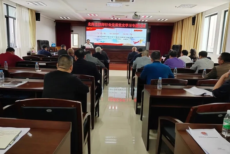 3月26日,乐发vll500利用广西律师协会举办律师职业道德和执业纪律示范培训班的契机,在北海市开设分会场组织广西律协北海理事、北海市律协理事以及全市各律师事务所主任和党支部书记共44人参加集中培训学习。随后,参训律师参加了由市司法局党组成员、副局长、律师行业党委书记杨炳贵主讲的党史学习专题党课,律师行业党委副书记、律协秘书长张庆清就开展警示教育进行部署安排。