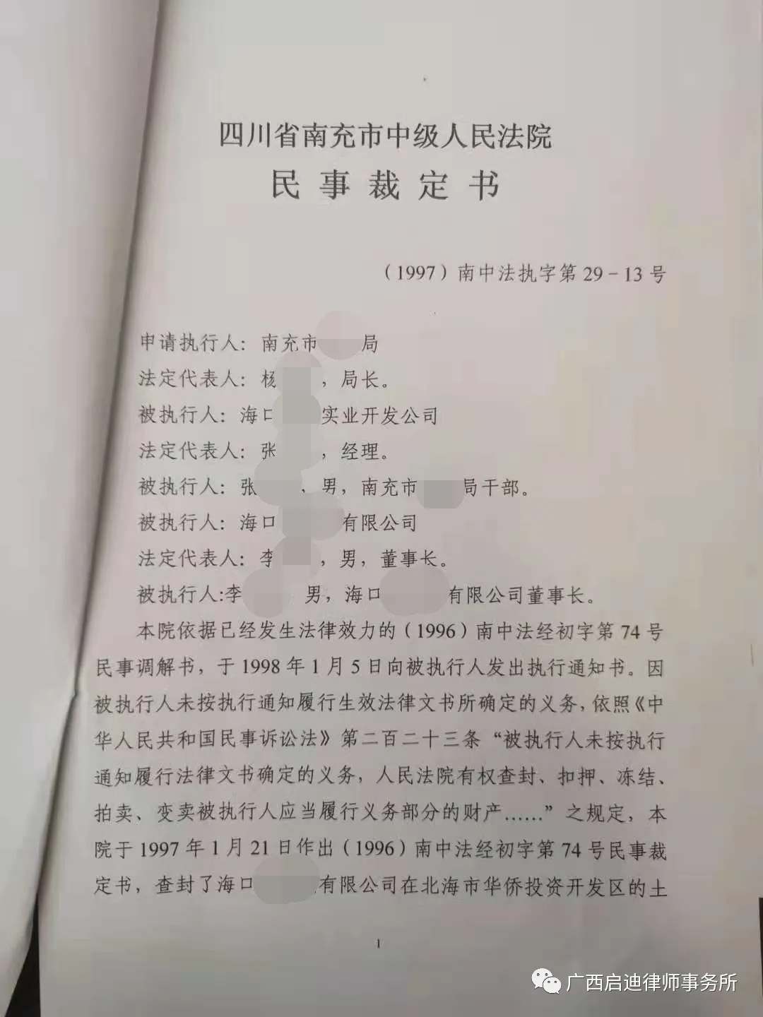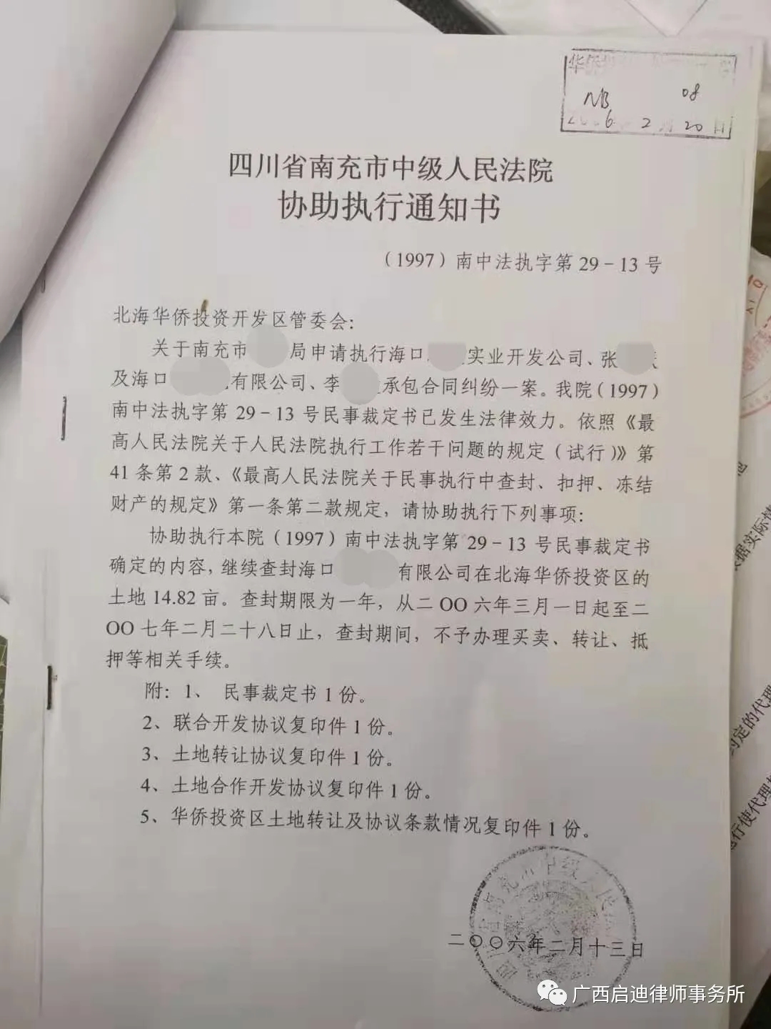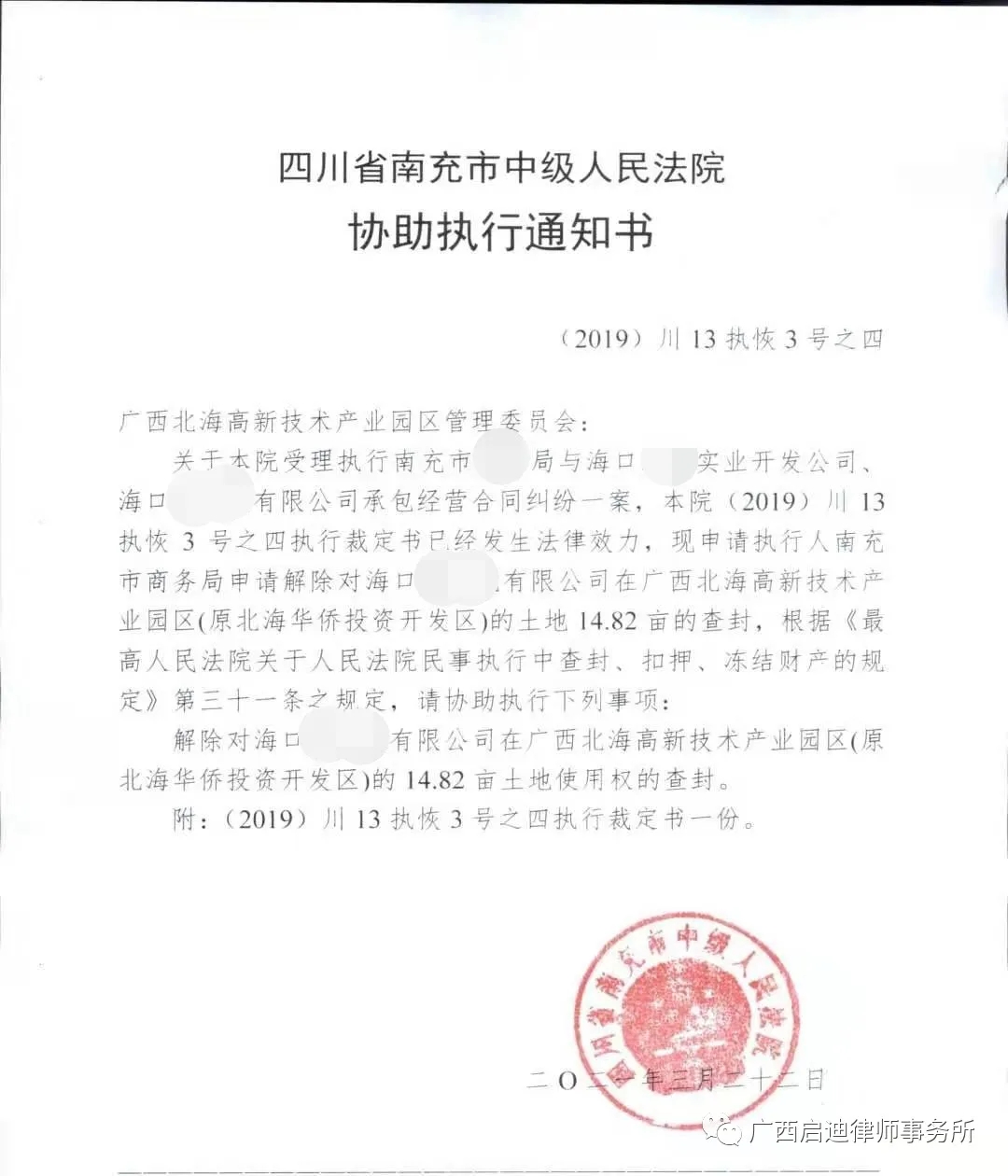 2021年4月1日四川省南充市中级人民法院向北海高新技术产业开发区管委会正式送达(2019)川13执恢3号之四民事裁定书和协助执行通知书,解除对海口某公司在北海高新技术产业园区(原北海华侨投资开发区)的14.82亩土地使用权的查封。至此,一桩执行了24年的历史遗留案件终于划上了句号。
