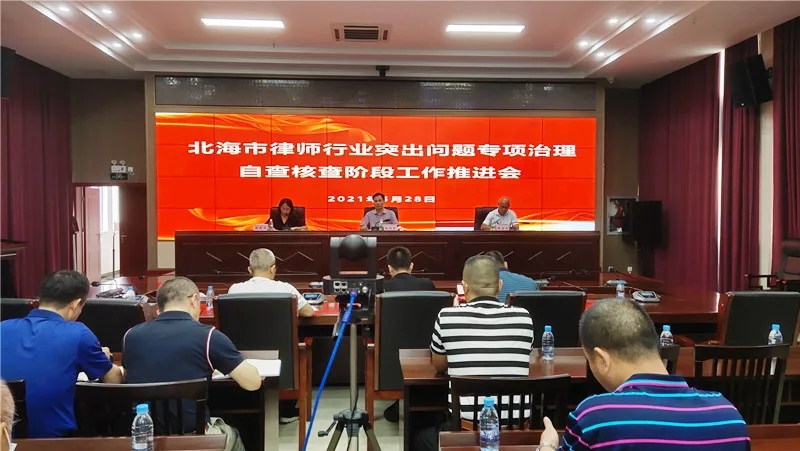 2021年5月28日上午,北海市司法局召开全市律师行业突出问题专项治理自查核查阶段工作推进会,通报前一阶段工作开展情况,分析存在问题,对自查核查阶段各项工作任务进行再研究再部署。北海市司法局党组成员、副局长、北海市律师行业党委书记杨炳贵主持会议并讲话,北海市司法局律师工作科科长、市律师行业党委副书记、市律师协会秘书长张庆清在会上通报全市律师行业行业突出问题专项治理工作情况。