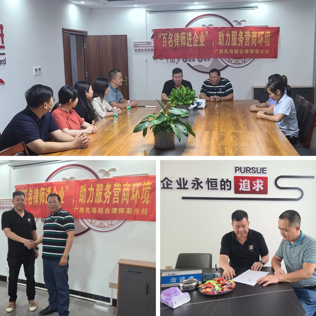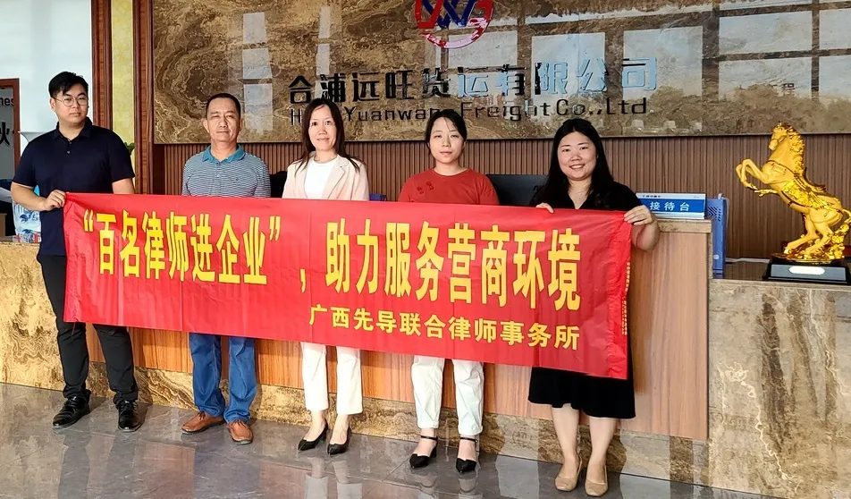 为庆祝建党100周年,助力乡村振兴,服务优化营商环境,北海市律师行业党委决定在全市律师行业开展“百名律师进企业”服务营商环境活动。近日,在广西先导联合律师事务所党支部书记谢如涛,党支部副书记王兴元的带领下,广西先导联合律师事务所律师走进合浦远旺货运有限公司,与企业共同开展“助力服务营商环境”的法律服务活动。