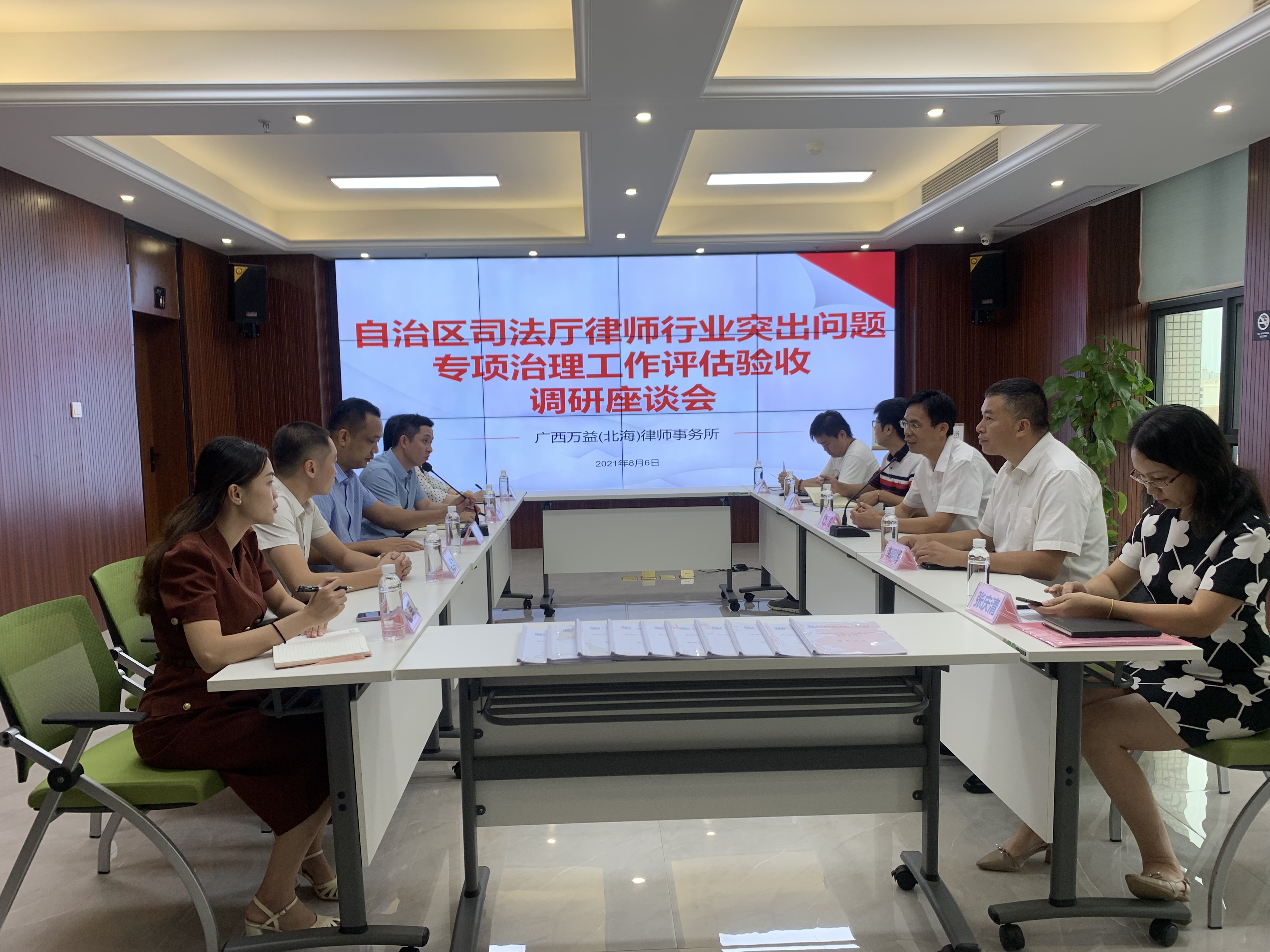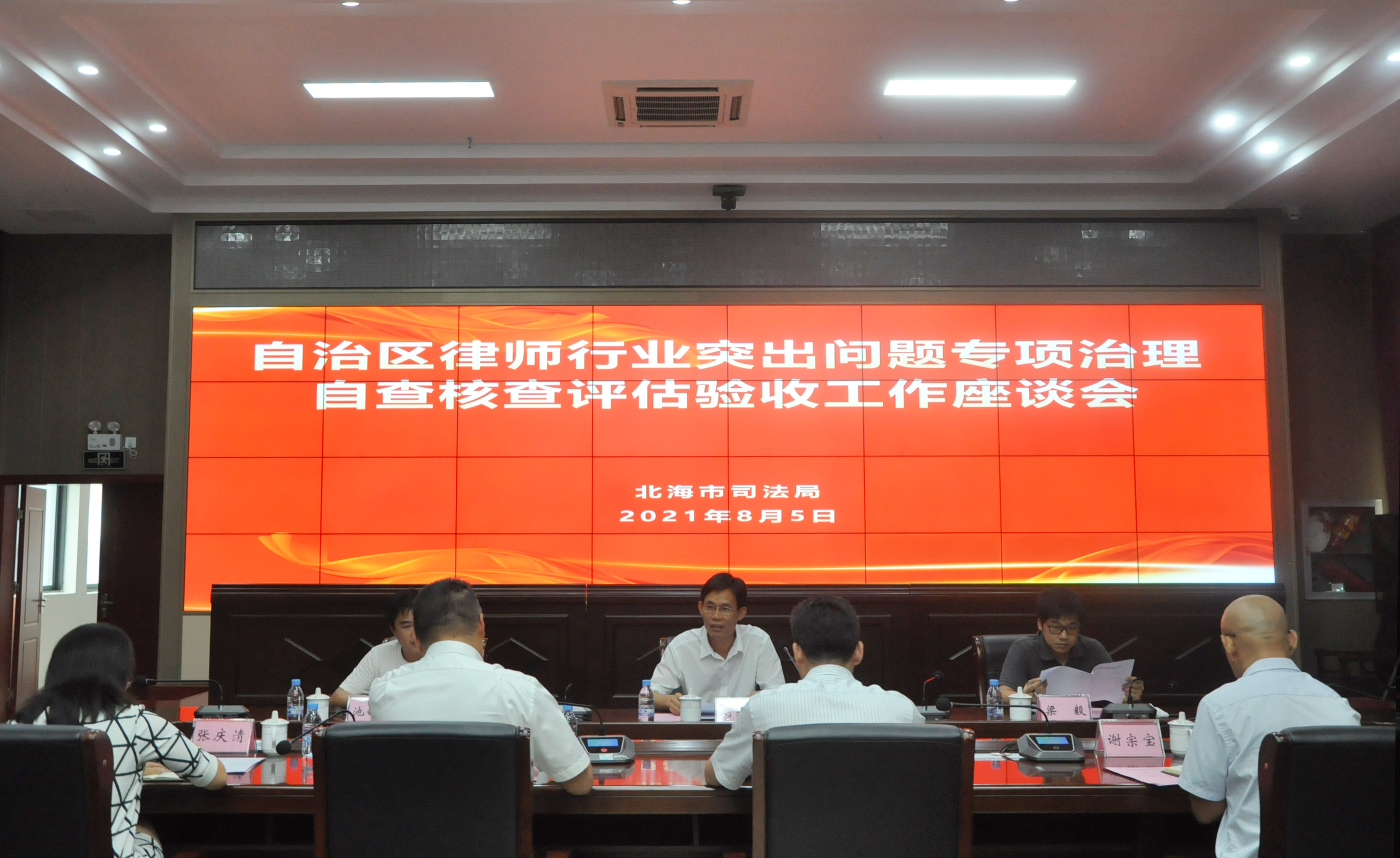 2021年8月5日至6日,由玉林市司法局党组成员、副局长刘承聪,玉林市司法局律师工作科科长梁毅、玉林市律师协会秘书处负责人池镇全组成的区司法厅律师行业突出问题专项治理自查核查评估验收组一行,对我市进行律师行业突出问题专项治理开展评估验收工作。北海市司法局党组书记陈劲,北海市司法局副局长、党组成员李明辉,律师工作科科长张庆清、市律师协会会长谢宗宝参加了座谈会汇报。