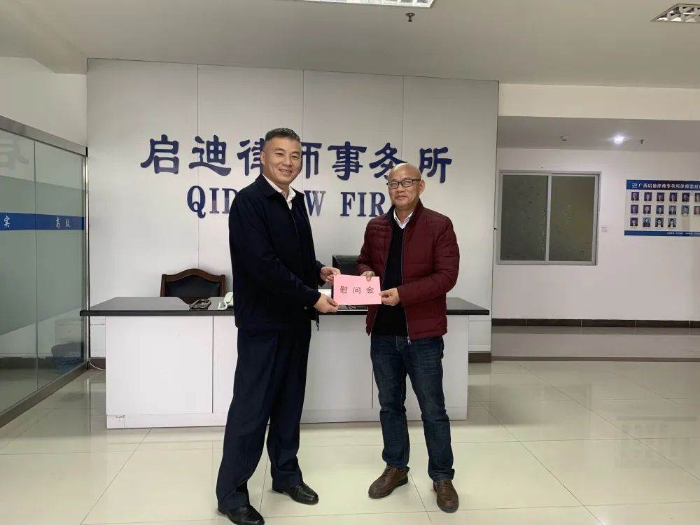 紧接着分别慰问广西现城律师事务所洪颖峰律师、广西桂三力(北海)律师事务所劳祺臻律师、广西启迪律师事务所卢波锋律师、广西珠浦律师事务所蒲剑律师,仔细询问患病律师的身体情况、家庭情况和康复情况等,仔细聆听了他们的诉求并鼓励他们树立信心,积极面对生活中的困难,祝他们早日康复,并为他们送上慰问金和新春祝福。