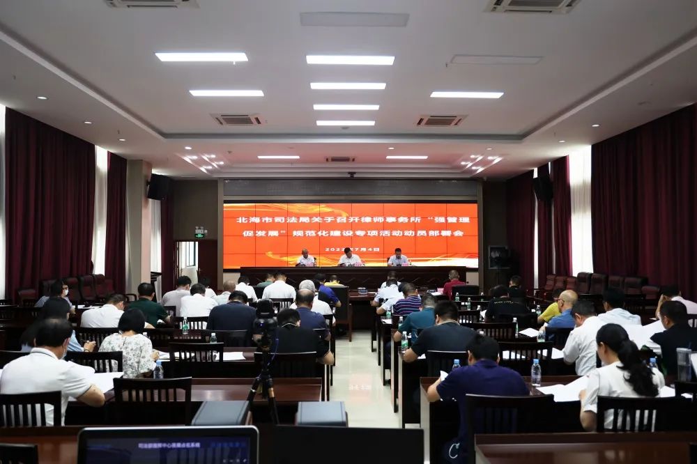 为贯彻落实自治区司法厅“强管理 促发展”规范化建设专项活动动员部署会的精神,促进北海市律师队伍建设和律师事业高质量发展,7月4日下午,北海市司法局召开全市律师事务所“强管理 促发展”规范化建设专项活动动员部署会议。北海市各县区司法局分管律师工作的副局长、市律师协会班子成员、市律师行业党委下辖各党支部书记、各律师事务所主任、市律师行业党委办公室、市律师协会秘书处共55人参会。