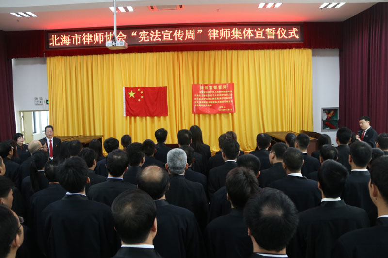 在第五个国家宪法日和第一个“宪法宣传周”即将到来之际,2018年12月2日,北海市律师协会在市司法局14楼会议室举行了“宪法宣传周”律师集体宣誓活动,80名律师代表参加了本次宣誓仪式。北海市司法局党组成员、副局长方诗生同志和北海市司法局公证律师管理科副科长钟琼同志到现场进行指导监督,活动由市律师协会副秘书长满耀志同志主持。