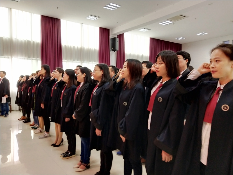 宣誓仪式上,统一穿着律师袍的律师们,在市律师协会副会长吴文钦的带领下,举起右拳,庄严地向宪法宣誓:我宣誓,我是中华人民共和国律师,忠于宪法,忠于祖国,忠于人民,维护当事人合法权益,维护法律正确实施,维护社会公平正义,恪守职责,勤勉敬业,为建设社会主义法治国家努力奋斗。