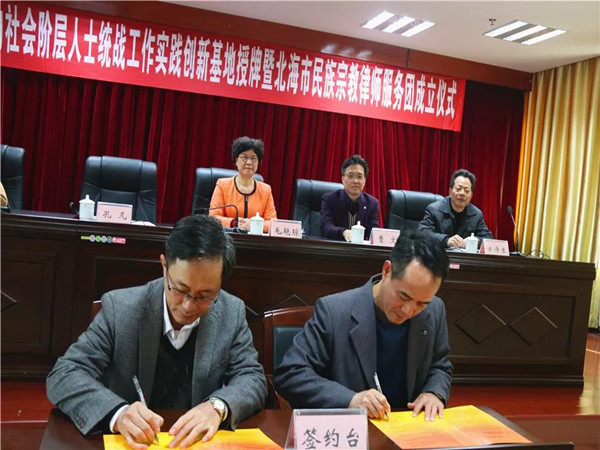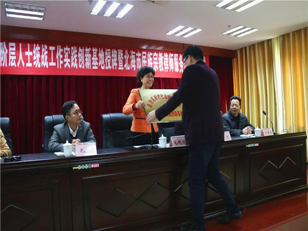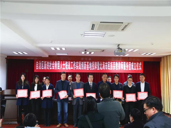 12月17日下午,自治区新的社会阶层人士统战工作实践创新基地授牌暨北海市民族宗教律师服务团成立仪式在北海市司法局举行。